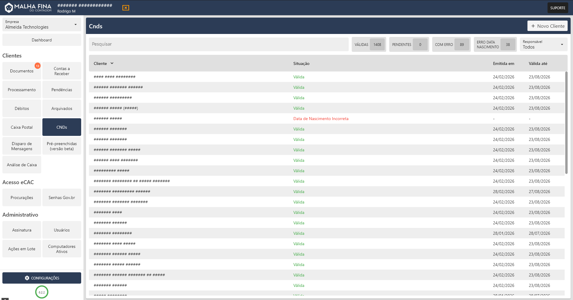 A aba CNDs (Certidão Negativa de Débitos) no Malha Fina do Contador funciona como uma ferramenta de monitoramento automático da regularidade fiscal dos clientes.